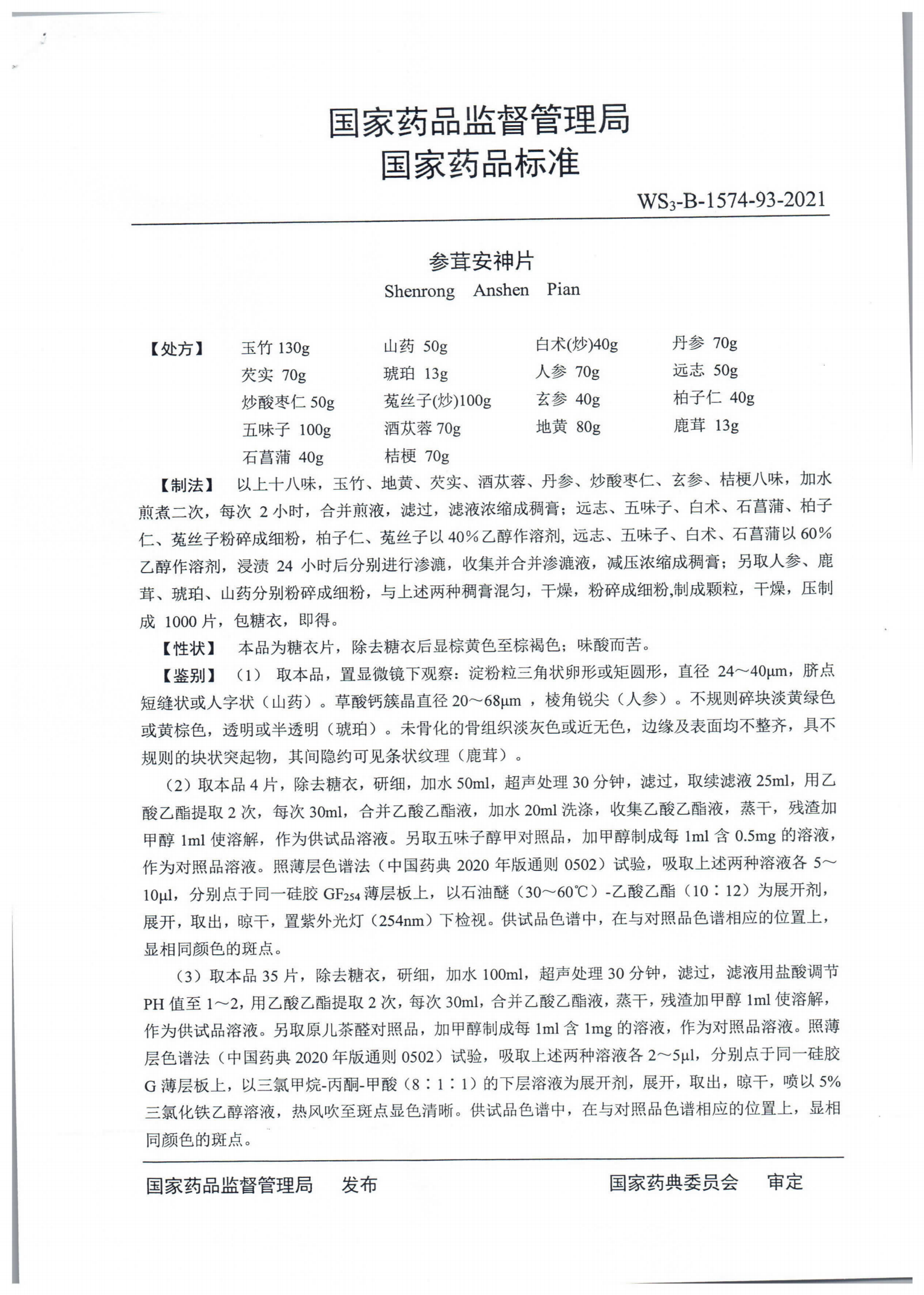 国家药品标准 | 参茸安神片WS3-B-1574-93-2021