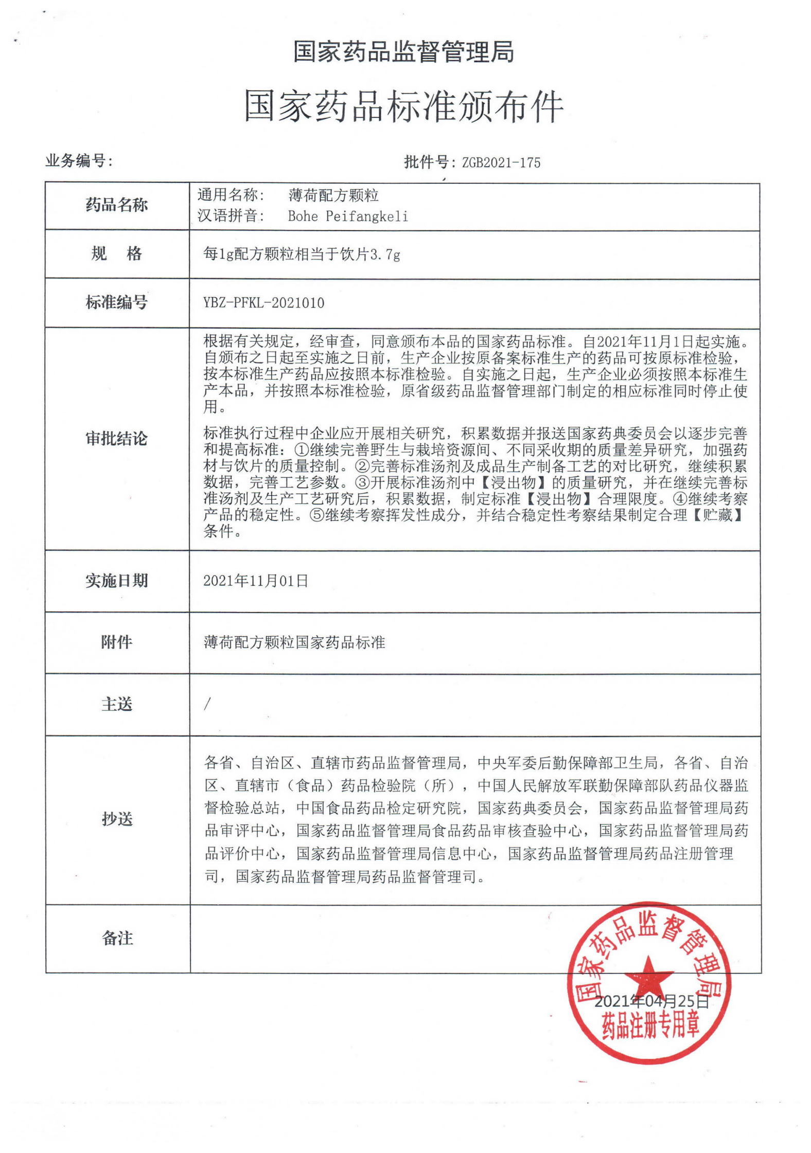 国家药品标准 | 薄荷配方颗粒 YBZ-PFKL-2021010