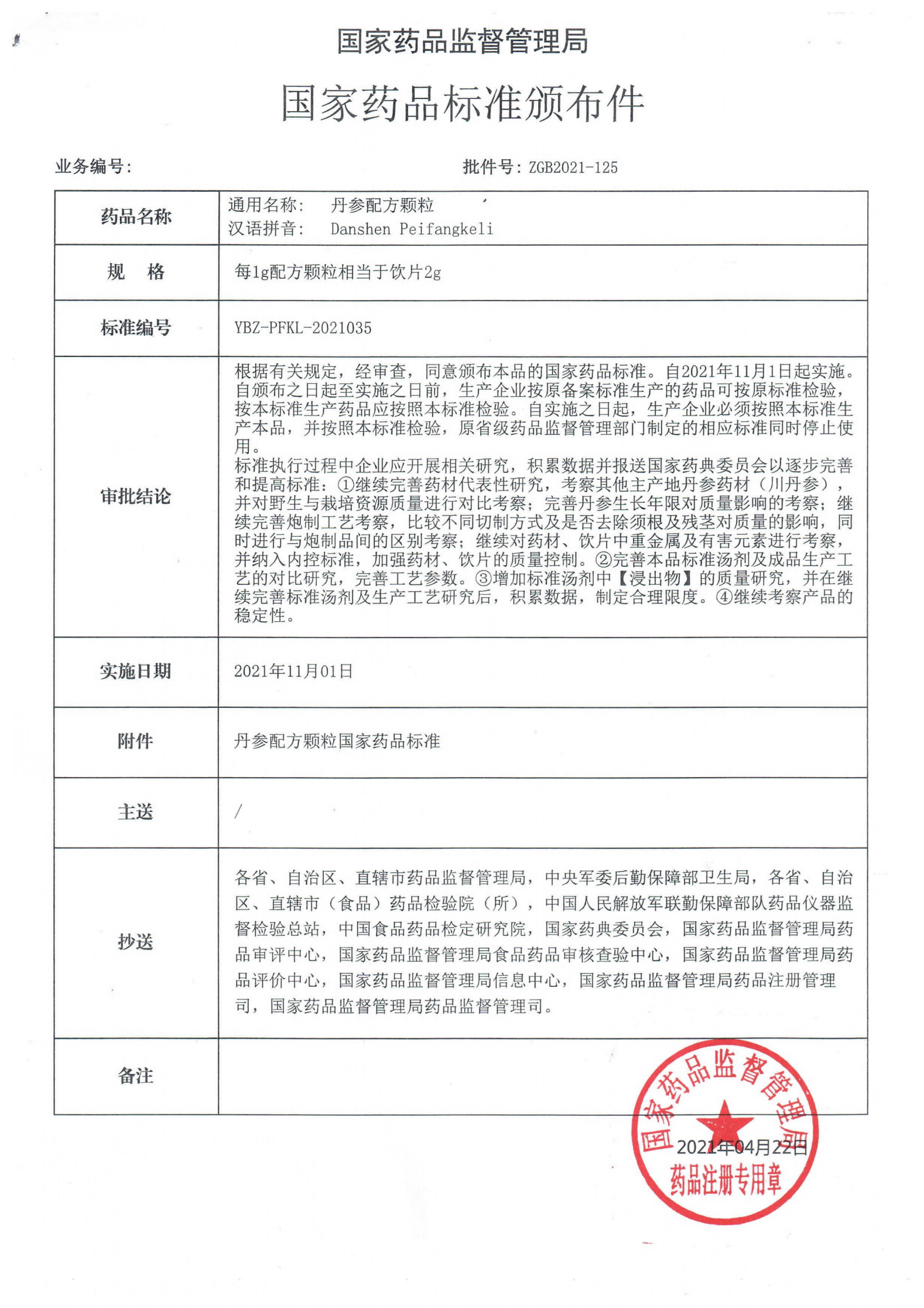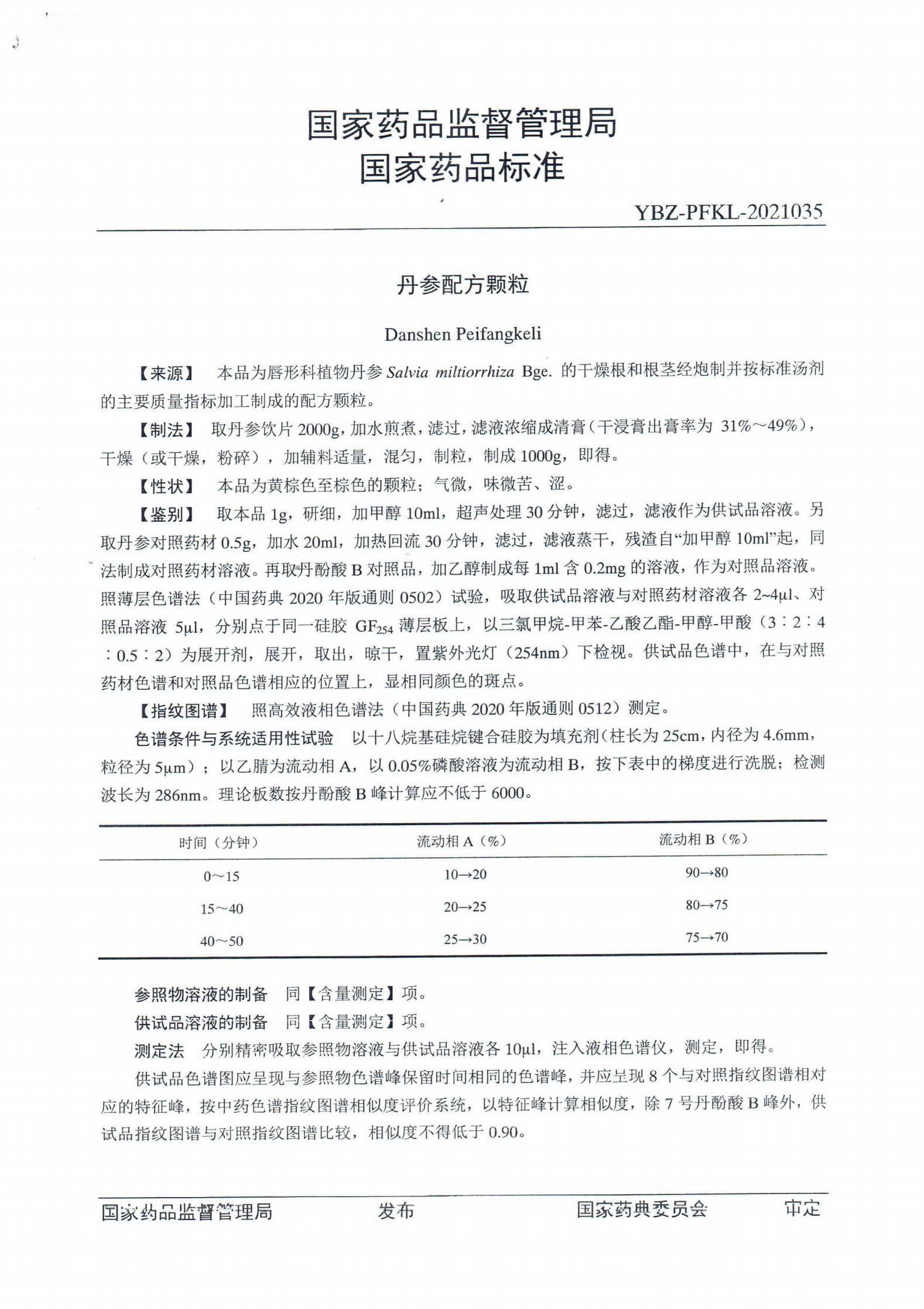 国家药品标准 | 丹参配方颗粒 YBZ-PFKL-2021035