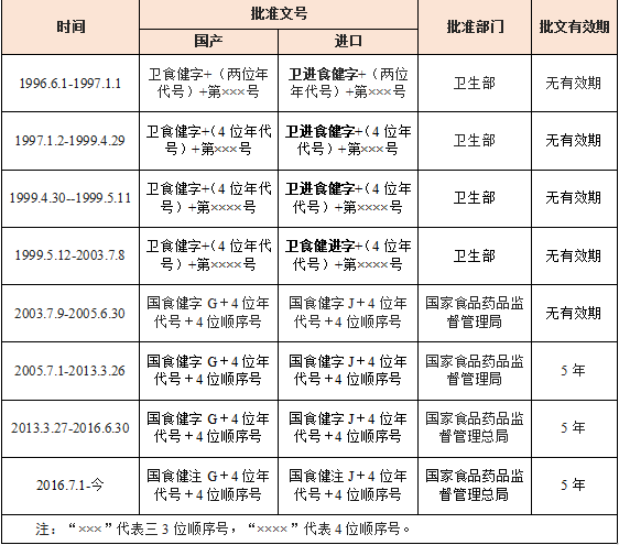保健食品批准文号是保健食品获得监管部门注册审批后而授予其表明合法身份的证明。保健食品的批准文号随其是国产还是进口、备案还是注册以及审批部门的变化而不同。因政策法规的变化和保健食品监管部门的调整,保健食品批文有效期也存在不统一性。2005年7月1号以前批准的保健食品批文均无有效期,7月1号之后批准的保健食品批文有效期为5年。