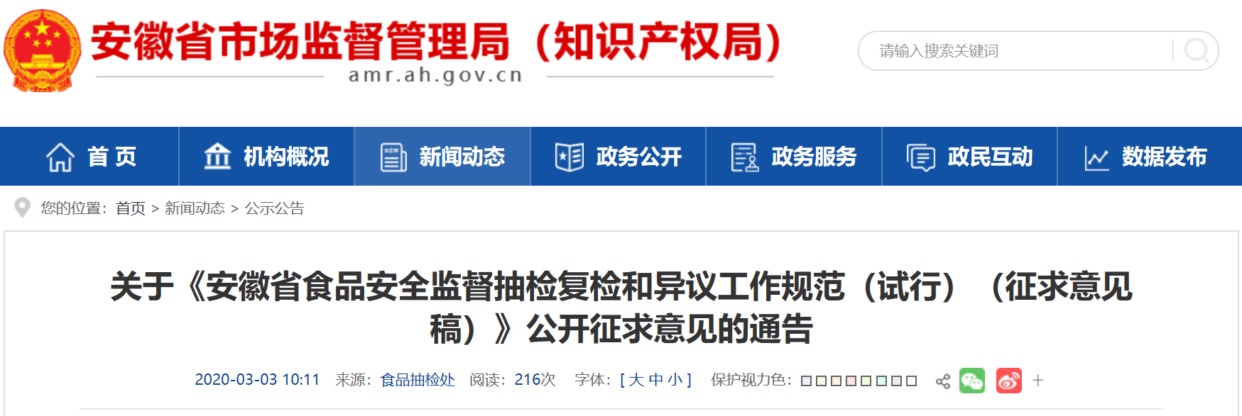 关于《安徽省食品安全监督抽检复检和异议工作规范(试行)(征求意见稿)》公开征求意见的通告